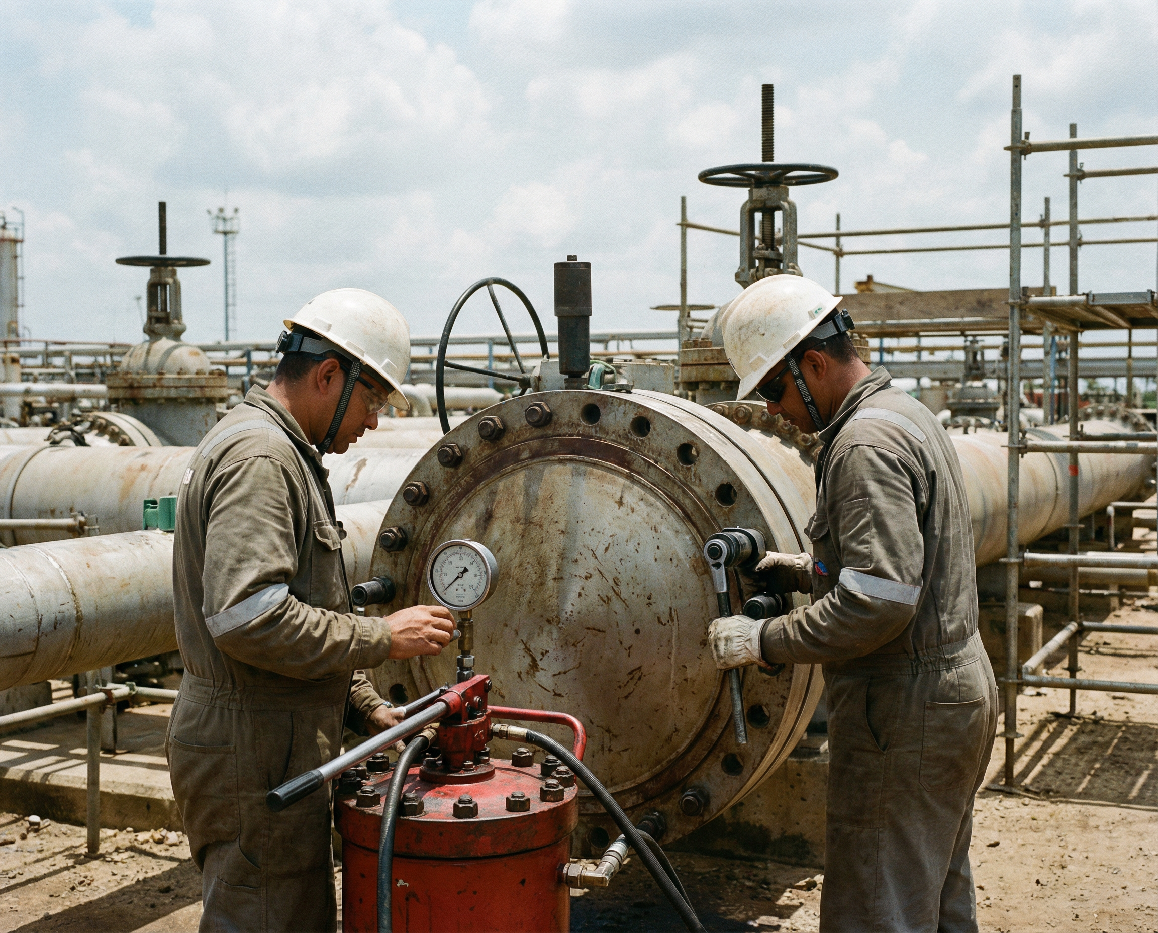 Ajuste preciso de pernos críticos mediante herramientas hidráulicas calibradas.